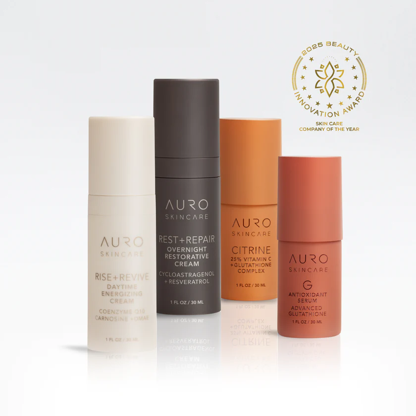 Your essential tools for transformation. This comprehensive set features the complete Auro protocol of ultra-potent antioxidant formulas, all powered by the patented, first-of-its-kind Auro GSH™ Antioxidant Delivery System.